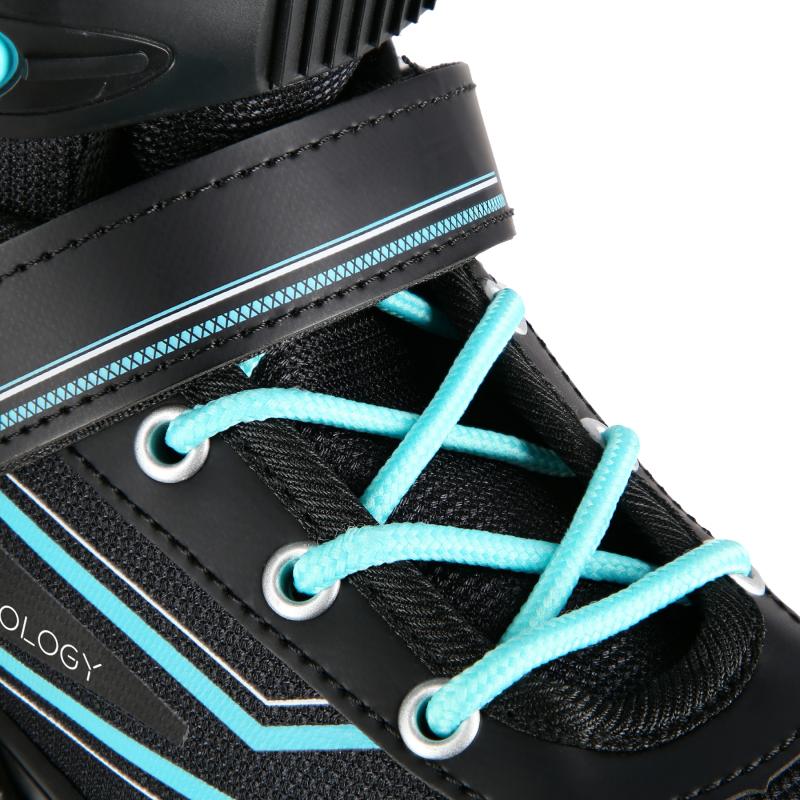 Hliníkový podvozek je osazen PU kolečky o tvrdosti 82A, ta je ideálním kompromisem mezi rychlostí, životností a pohodlím. Kolečka jsou osazena ložisky ABEC 7 pro svižnou a plynulou jízdu. Skelet brusle je vyroben z polypropylenu, který dobře přenáší energii z odrazu na kolečka a zároveň vydrží i připadný pád. Pohodlná, poloměkká bota je vyrobena z kombinace semiše, síťoviny MESH - pro dobrou prodyšnost, EVA a pěny o vysoké hustotě. Vnitřní bota nemá krytou špičku, takže dobře větrá a noha se méně potí. Zapínání je řešeno klasickou trojkombinací - šněrování, řemínek se suchým zipem a dvousekční přezka. Pravá brusle je osazena brzdou.