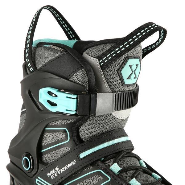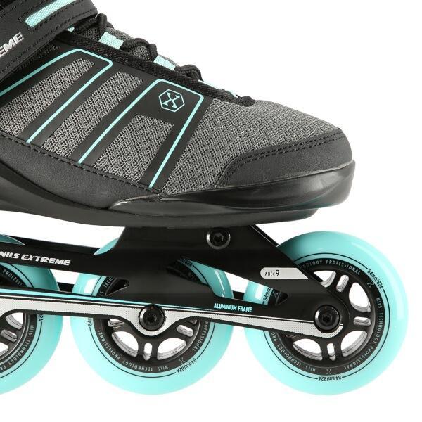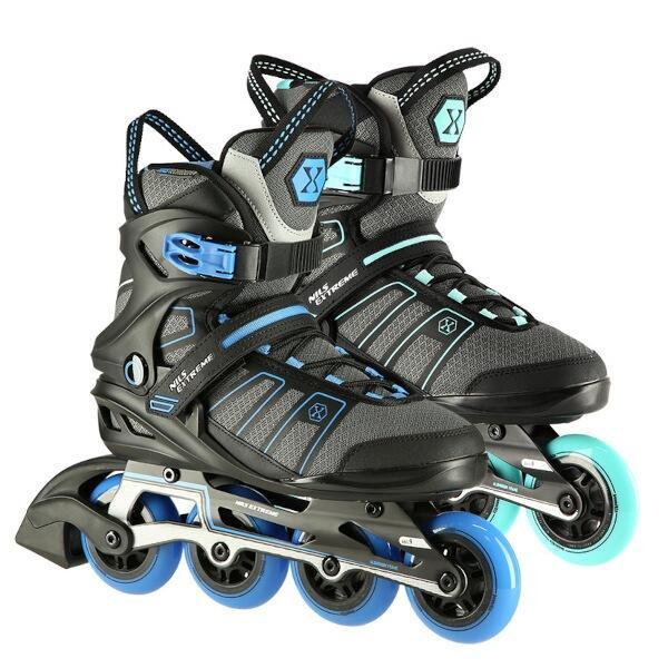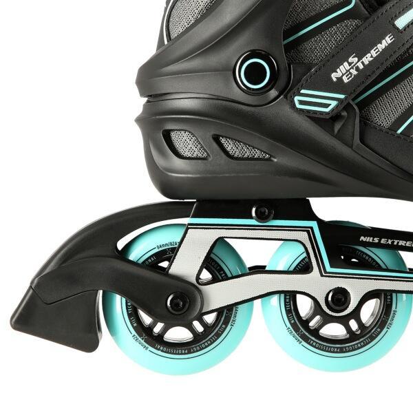 Kolieskové korčule NILS Extreme NA14217 sú určené na rekreačnú jazdu stredne pokročilých a pokročilých korčuliarov po rovných a hladkých chodníkoch, ako napríklad po asfalte. Polomäkká, ľahká a odolná topánka je vyrobená z kombinácie sieťoviny MESH a peny EVA, vnútorná časť topánky je potiahnutá semišom. Skelet modelu NH14217 je vyrobený z polypropylénu, ktorý je veľmi odolný a vydrží aj tie najtvrdšie pády, zároveň stabilizuje chodidlo v oblasti členka. Bezpečnosť korčule zvyšuje zapínanie na dvojsekčnú pracku, remienok so suchým zipsom a šnurovanie. Polyuretánové kolieska s tvrdosťou 82A dobre priliehajú k podkladu a sú uložené v hliníkovej klietke vyrobenej z jedného kusu hliníka, ktorý je vstrekovaný do formy pod vysokým tlakom. Model NA14217 je osadený ložiskami ABEC 9, ktoré sa vyznačujú nízkym odporom, vďaka čomu má jazda dobrú zotrvačnosť a na korčuliach tak možno dosiahnuť vysokú rýchlosť, alebo prejsť väčšiu vzdialenosť bez zbytočnej námahy.