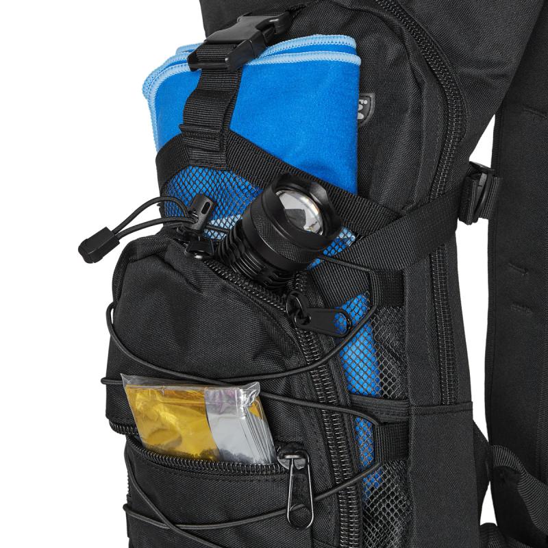 Po stranách jsou kompresní popruhy, které stahují hlavní komoru i síťované kapsy, čímž zvyšují stabilitu a pevnost batohu. Na horní straně je robustní ucho pro pohodlné přenášení v ruce. Zadní strana i ramenní popruhy jsou vyrobeny z polyesteru bez polstrování, což batoh činí lehkým, ale méně komfortním při delším nošení. Ramenní popruhy mají gumové poutko pro hadičku hydrovaku a hrudní popruh, který je možné nastavit jak výškově, tak délkově. Bederní popruh je široký 3,5 cm a má robustní přezku pro lepší stabilitu při nošení.