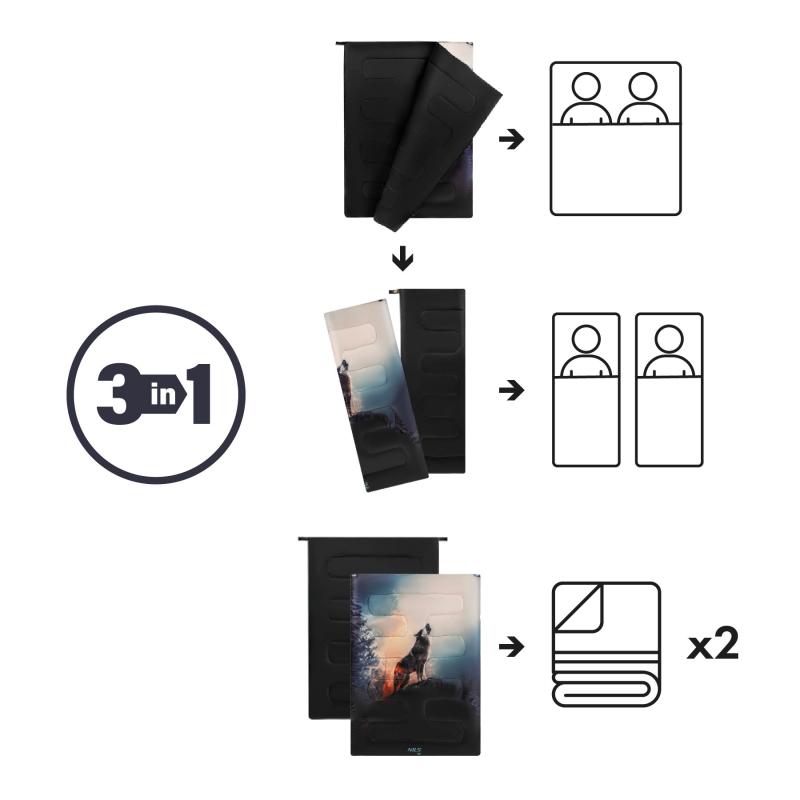 Spacák NC3601 od spoločnosti NILS Camp je jedinečný model navrhnutý pre maximálnu funkčnosť a pohodlie počas kempovania, stanovania alebo prenocovania v prírode. Jeho konštrukcia umožňuje použitie v troch rôznych variantoch - ako dvojitý spacák, dva samostatné spacáky alebo dve nezávislé prikrývky. Toto riešenie je ideálne ako pre páry, tak pre sólo cestovateľov. Systém zipsov umožňuje spacáky ľahko a rýchlo oddeliť alebo spojiť, čo poskytuje veľkú slobodu pri používaní a umožňuje prispôsobiť ho každej situácii.