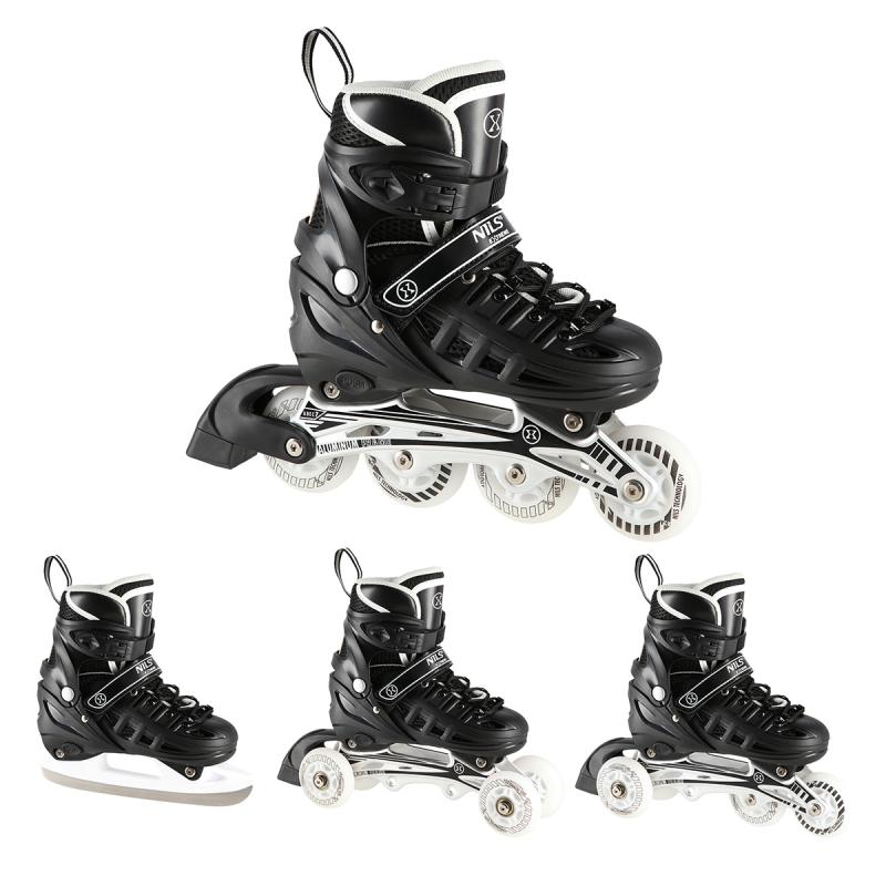 Korčule NILS Extreme NH10905 sú multifunkčný model, ktorý ponúka hneď 4 možnosti zostavenia podvozku – ako korčule na ľad, in-line korčule, tanečné (quad) korčule a pre najmenších kombináciu 2+1+1 + nôž na ľad. Vďaka tomu ide o univerzálne riešenie, ktoré sa prispôsobí veku i zručnostiam používateľa a poskytne radosť z jazdy po celý rok.