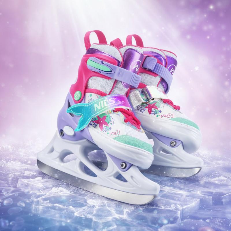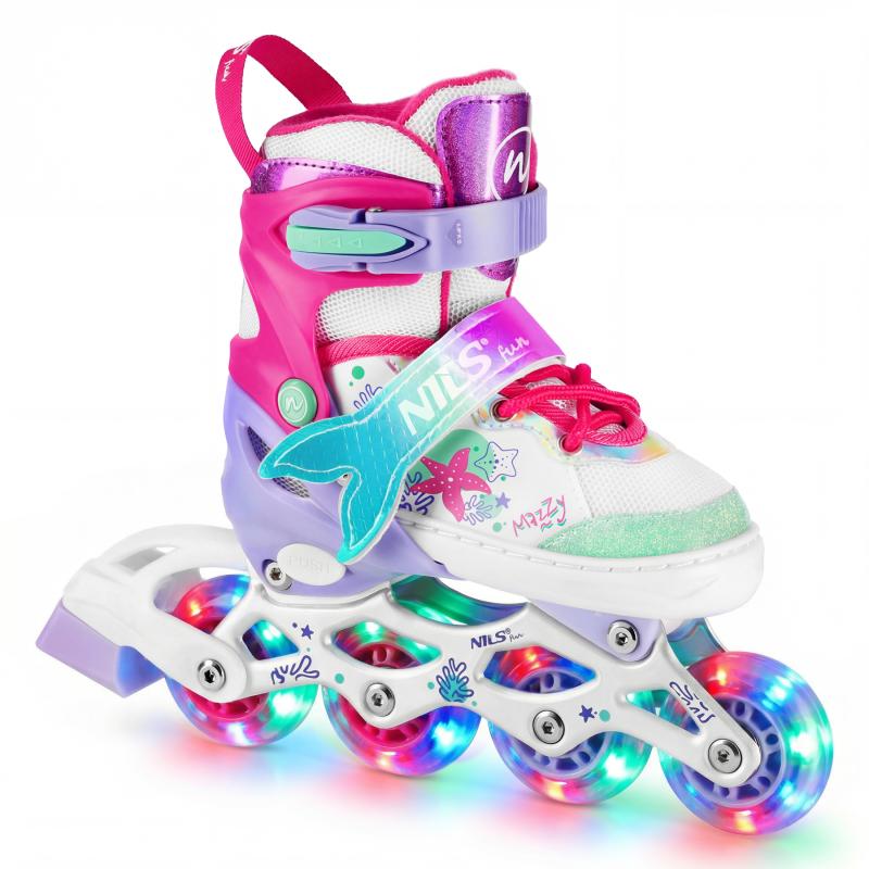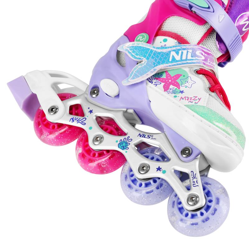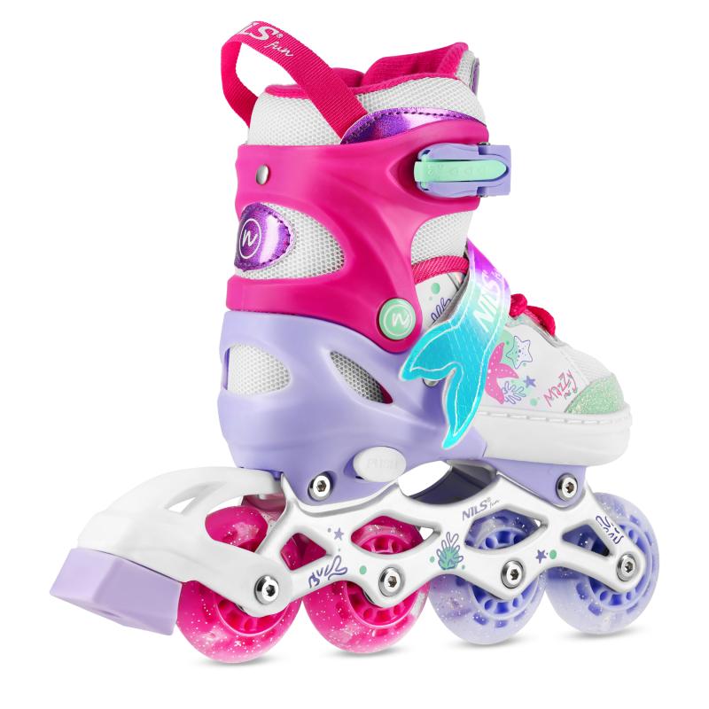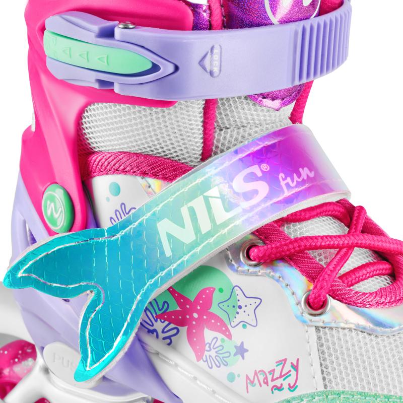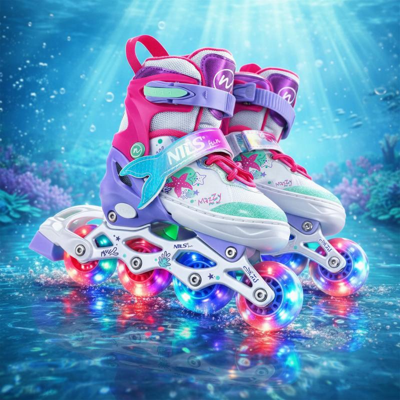 NH18150 MAZZY značky NILS Fun je jedinečný detský set 4v1, ktorý spája funkčnosť, bezpečnosť a atraktívny rozprávkový dizajn inšpirovaný podmorským svetom. Jeden produkt ponúka hneď štyri konfigurácie – kolieskové korčule, ľadové korčule, quad korčule a 2+1+1 pre začiatočníkov – a je tak ideálny na celoročné využitie.
