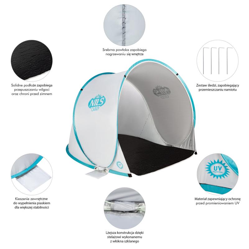 Plážový stan NILS Camp NC3173 využijete nejen během dovolené u moře, ale také na veřejném koupališti, nebo u bazénu na zahradě. Stan NC3173 se okamžitě rozloží, je odolný a funkční, ale především poskytne účinnou ochranu před slunečními paprsky, poskytne stín a zároveň úkryt před větrem.