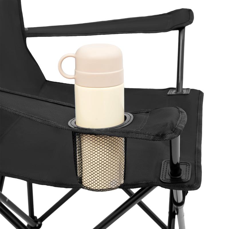 NILS Camp NC3301 je turistická stolička doplnená o bočný držiak nápojov. Jej konštrukcia zabezpečuje komfortný odpočinok bez ohľadu na miesto – či už ide o dovolenku v kempe, piknik v parku alebo posedenie s priateľmi na záhrade. Sedák a operadlo sú vyrobené z odolného polyesteru 600D s PE náterom, odolného proti oderu a vlhkosti. Čierny lem zabezpečuje čistý vzhľad a celú stoličku drží stabilný oceľový rám s čiernym práškovým lakom.