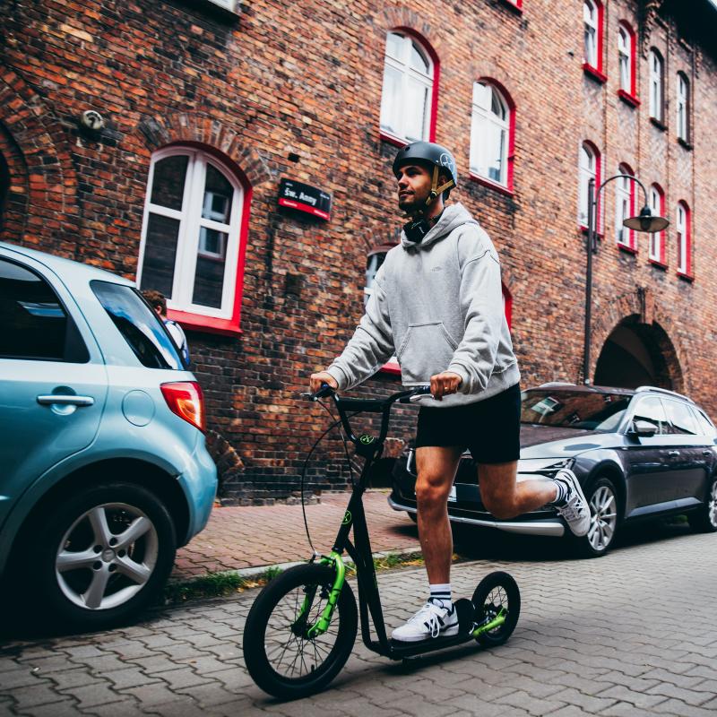 Rám kolobežky je vyrobený z hliníkovej zliatiny, ktorá kombinuje ľahkosť s odolnosťou proti mechanickému poškodeniu. Dopĺňajú ho oceľové riadidlá, ktoré zabezpečujú tuhosť a stabilitu pri jazde. Napriek robustnej konštrukcii váži kolobežka iba 8,5 kg, čo uľahčuje jej prenášanie, prepravu a každodenné používanie - napríklad pri ceste do školy, do práce alebo na stretnutie s priateľmi.