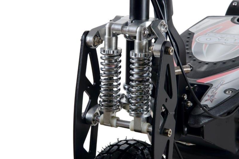 Tento model je vybaven jak předním tak zadním odpružením. Významnou inovací je přidání další pružiny do přední nápravy. Výsledkem je dokonalejší odpružení se zvýšenou bezpečností. Pružiny doplňují masivní bočnice v kombinaci s námi vyvinutým systémem vahadlového pružení pomocí ložisek. Starý systém (uložení napevno), který se stále u neznačkových koloběžek objevuje, byl velmi problematický.