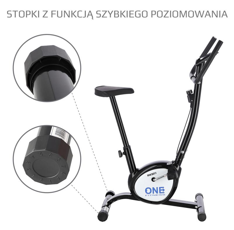 Mechanický volič umožňuje plynulé nastavenie záťaže, pohodlné sedlo je výškovo nastaviteľné do 6 polôh, pedále sú opatrené remienkami a ich dĺžku možno nastaviť pomocou suchého zipsu. Tieto prvky sú zárukou komfortného tréningu. Vďaka absencii záťažového kolesa je rotoped ľahký, má iba 9,4 kilogramu, a je možné ho jednoducho prenášať. Výškovo nastaviteľné koncovky na zadnom stabilizátore umožňujú vyrovnanie trenažéra do roviny. Vzhľadom na konštrukciu je mechanický rotoped ONE Fitness RW3011 vhodný pre doplnkový tréning alebo ako vedľajšia pohybová aktivita, nosnosť je 100 kg.