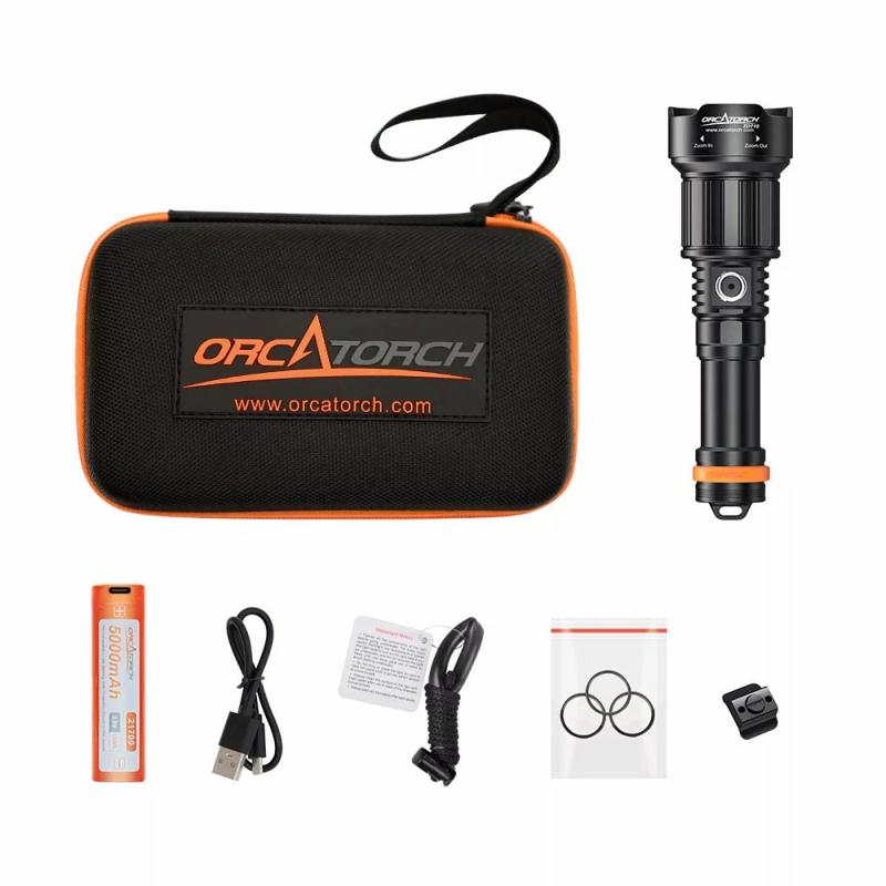 Orcatorch představuje zoomovatelnou potápěčskou svítilnu. Toto světlo pro potápěče má 2700 lm a extra vysokou svítivost s nastavitelným úhlem paprskem 8°~76°.Odolné a kvalitní světlo pod vodu disponuje 4 režimy svícení.