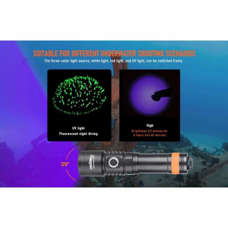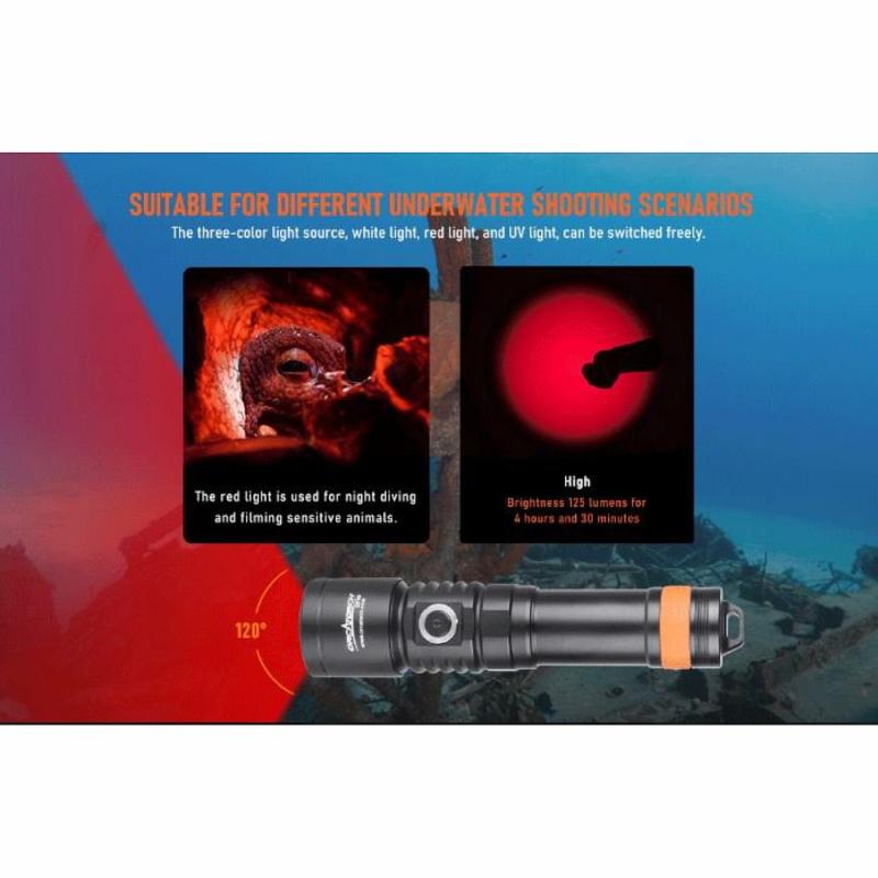 Červené světlo je ideální pro fotografování plachých zvířat pod vodou. UV světlo je určeno pro fluorescenční noční potápění bez potřeby použití filtrů. V režimu bílého paprsku máte k dispozici dva jasové módy. Indikátor stavu baterie je integrován do bočního spínače a vždy vám poskytne informaci o zbývající energii baterie.