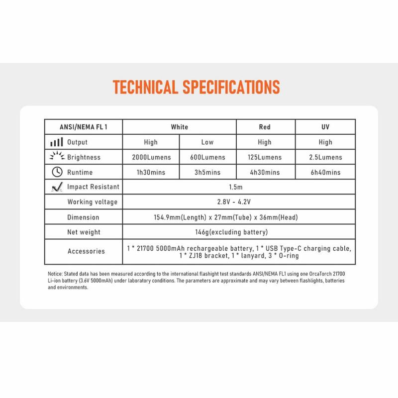 Režimy jasu: bílý: max. 2000 lm, min. 600 lm, červený: 125 lm, UV: 2,5 lm