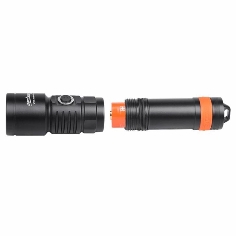 Červené svetlo je ideálne na fotografovanie plachých zvierat pod vodou. UV svetlo je určené pre fluorescenčné nočné potápanie bez potreby použitia filtrov. V režime bieleho lúča máte k dispozícii dva jasové módy. Indikátor stavu batérie je integrovaný do bočného spínača a vždy vám poskytne informáciu o zostávajúcej energii batérie.