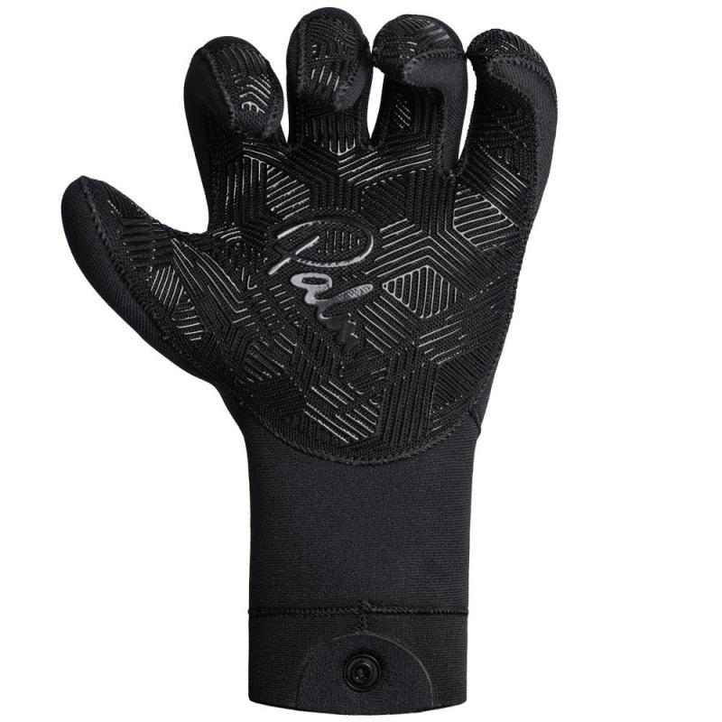 Dlaňová část a prsty jsou vyztuženy materiálem Amara, který je měkký, ohebný a odolný vůči opakovanému namáčení. Protiskluzový potisk na dlaních zajišťuje jistý úchop za všech podmínek. Anatomicky předtvarované prsty snižují únavu rukou při dlouhém držení pádla nebo lana. Švy jsou lepené a šité slepým stehem, což výrazně omezuje pronikání vody a zvyšuje tepelnou izolaci. Oblast palce a ukazováčku je dodatečně vyztužena pro lepší odolnost vůči tření při práci s lanovými systémy nebo vyprošťování lodí.
