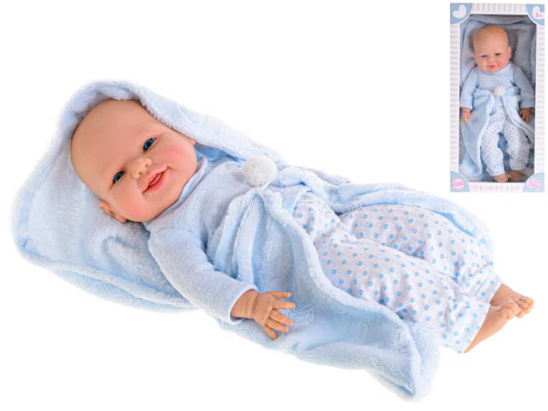 Vysoce kvalitní vinylová panenka - chlapec, miminko s velmi realisticky zpracovaným, tvrdým tělíčkem. Toto novorozené dítě si můžete vzít kamkoli. Díky dečce a modrému pyžámku je vždy v teple a pohodlí. Baleno v okrasné krabici s