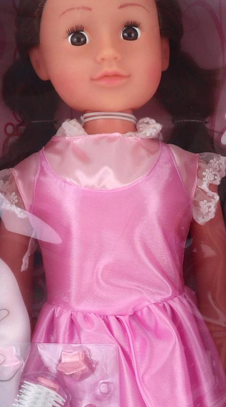 Krásná velká chodící panenka v růžových šatech. Panenka má pohyblivé nohy a ruce a lze s ní chodit - držením za ruce a tažením panenky vpřed se automaticky pohybují i nohy. (mechanickáfunkce - není na
