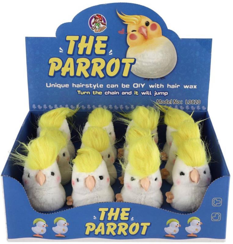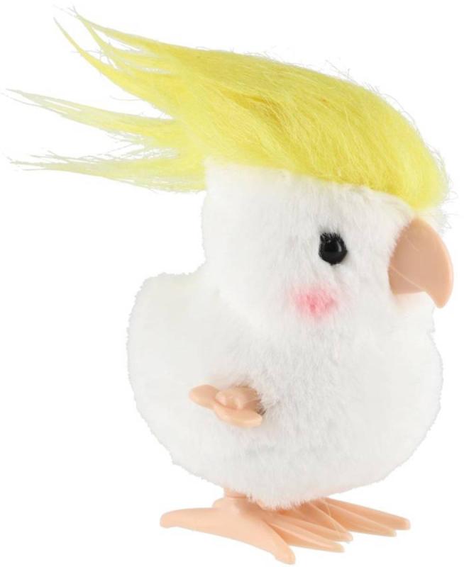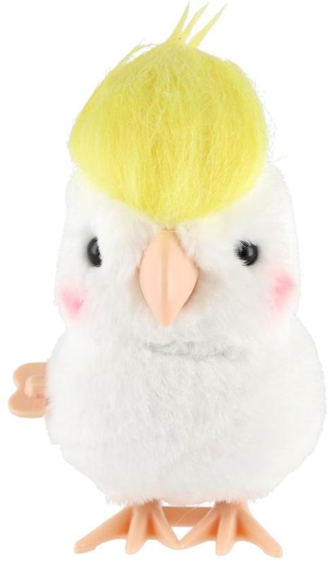 Veselý natahovací papoušek kakadu z plyše a plastu, který po natažení na klíček poskakuje. Velikost 9cm.