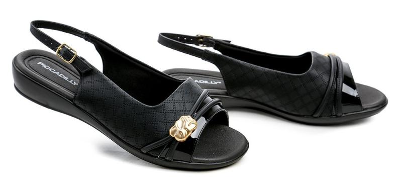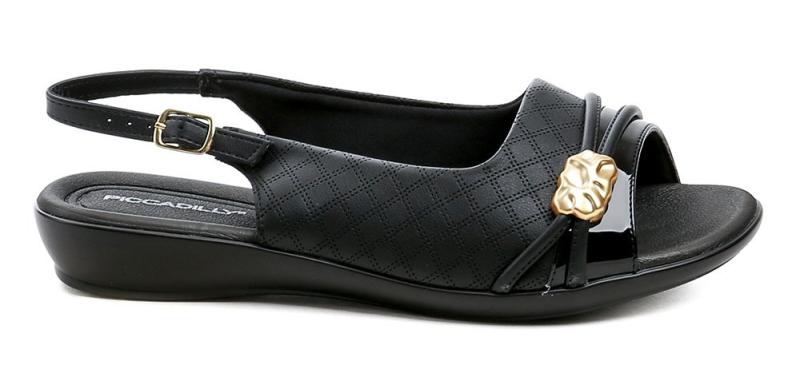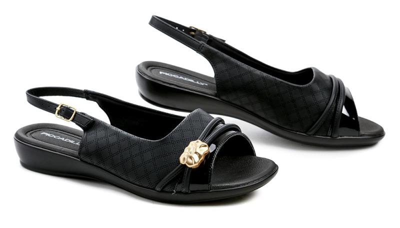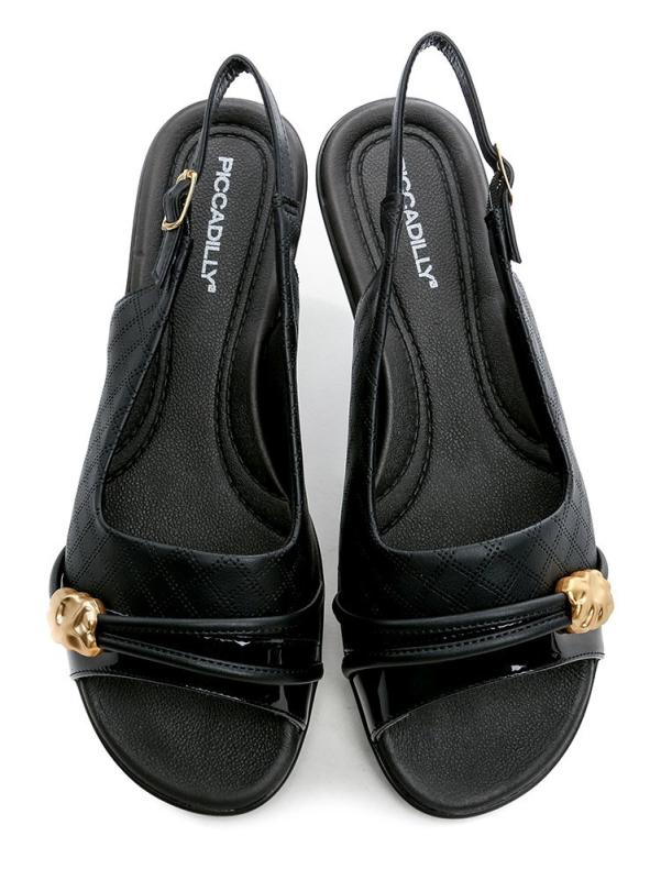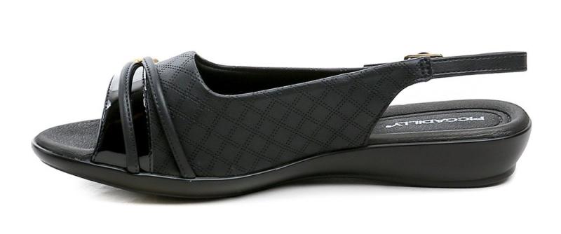 Dámska letná zdravotná obuv ponúka pohodlie a stabilitu vďaka nízkemu klinu a voľnej špičke i päte, čo zabezpečuje dostatok priestoru pre nohy aj pri dlhšom nosení.\n\nSandáliky pochádzajú od brazílskej značky Piccadilly a sú vyrobené z kvalitného syntetického materiálu, ktorý je odolný a zároveň ľahký. Vnútorná časť je vybavená polstrovanou textilnou podšívkou, ktorá zvyšuje komfort a príjemný pocit pri kontakte s pokožkou.\n\nSUPER SHAPE je špeciálna technológia založená na trojrozmernom meraní chodidla, ktorá zaručuje optimálny tvar obuvi a výrazne tak zlepšuje pohodlie pri chôdzi. Podšívky obsahujú penu prispôsobujúcu sa tvaru nohy, čo ocenia najmä užívateľky s citlivými chodidlami.\n\nEXCLUSIVE INSOLES znamenajú gélové opätky v pätnovej časti, ktoré znižujú tlak a zabraňujú bolestiam či poraneniam päty. Pri modeloch na vysokých podpätkoch sú navyše gélové vložky umiestnené aj v oblasti brušiek prstov, čo zabezpečuje pohodlnejšiu chôdzu aj v módnych variantoch obuvi.\n\nBUNION označuje použitie mäkkého materiálu v oblasti palcového kĺbu, vďaka čomu sú sandále vhodné aj pre chodidlá s haluxmi, pretože minimalizujú tlak a podráždenie tejto citlivej oblasti.\n\nObuv je ponúkaná v širšej šírke H, čo poskytuje viac priestoru pre širšie chodidlá a prispieva k lepšiemu komfortu.\n\nHmotnosť jedného páru je iba 280 g, čo zaručuje ľahkosť a jednoduchosť nosenia.\n\nParametre:\n• Farba: čierna\n• Vonkajší materiál: syntetika\n• Vnútorný materiál: syntetika\n• Výška topánky: 8 cm\n• Výška opätku: 3 cm\n• Šírka obuvi: H (širšia)\n\nTieto sandále sú ideálnou voľbou pre ženy hľadajúce zdravotne nezávadnú obuv s dostatočným priestorom pre nohy, ktorá zároveň ponúka stabilitu a pohodlie v letných mesiacoch. Vďaka použitým technológiám a materiálom pomáhajú zmierniť tlak na citlivé časti chodidiel a sú vhodné aj pre nositeľky s haluxmi.\n\nVyberte si obuv, ktorá rešpektuje tvar vášho chodidla a poskytne vám komfort počas celodenného nosenia.