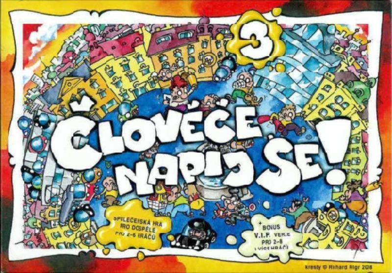 Společenská hra*Namaloval a vymyslel Richard PilgrHra Člověče napij se! 3 - Společenská hra Člověče napij se 3 je dalším pokračováním úspěšných her Člověče napij se 1a2. Společenská hra obsahuje 2 zcela nové herní plány. První je založen na skvěle fungujícím okruhu z jedničky ovšem matematicky přepracován pro 6 hráčů ,zasazen do prostředí města a doplněn o plno vychytávek jako např.kruhový objezd. Bonus Člověče napij se V.I.P. je hra zasazena do milého prostředí hospůdky a je to závod o volná místa u stolu. Herní plán hry Člověče napij se V.I.P. je založen na bázi startu a cíle a může ji hrát 2-8,ale i více hráčů.