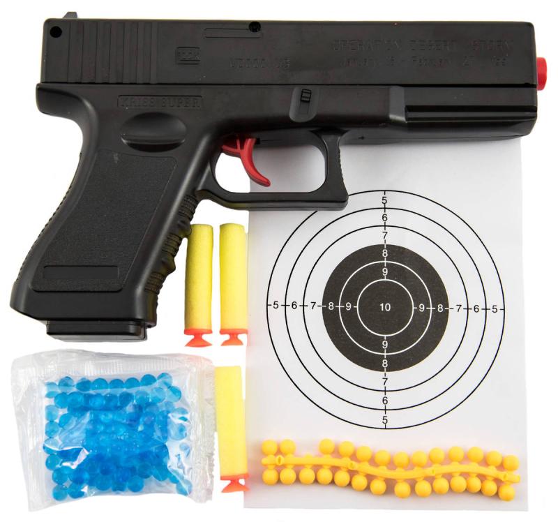 Obsah balení: dětská zbraň, terč, pěnové náboje, gumové kuličky, vodní kuličky