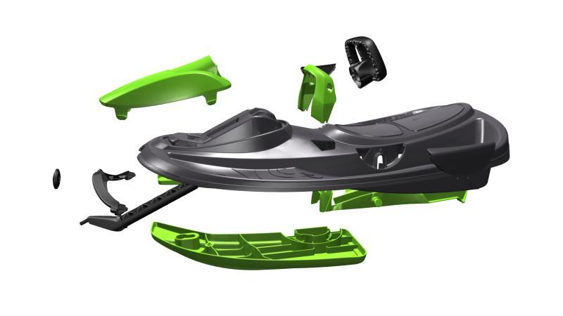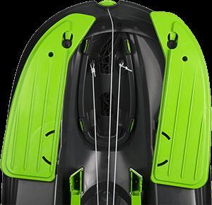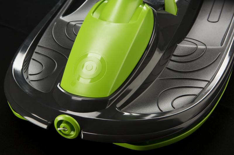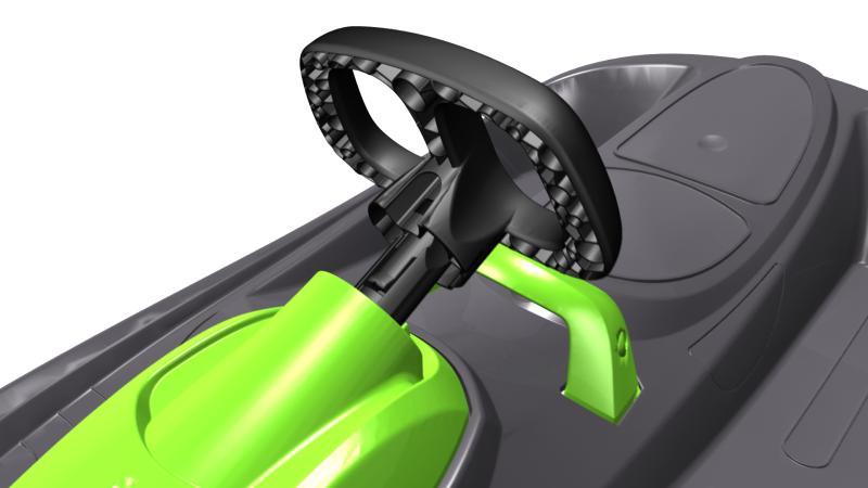 Stylový design závodní formule. Středová brzda pro větší bezpečí. Originální provedení se čtyřmi lyžinami. Zaručuje snadné zatáčení. Zatáčení pomocí diferenciálu zvyšuje rychlost v zatáčkách, protože každá lyže může zatočit pod jiným úhlem. Samonavíjecí mechanismus tažného lana. Masivní brzda s pružinou pro navrácení do původní polohy. Žádné kovové prvky ani šrouby, nemusíze mít obavu z koroze a montáž není nutná. Možnost jízdy ve 2 lidech. Zobrazit celý popis