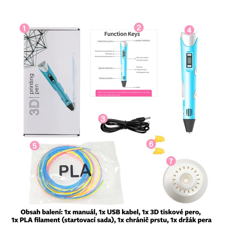 - obsah balení - 3D pero s LCD displejem, USB kabel, startovací sada PLA filamentů, 2x chránič prstu a praktický držák pera