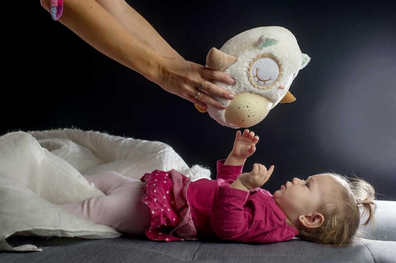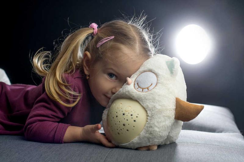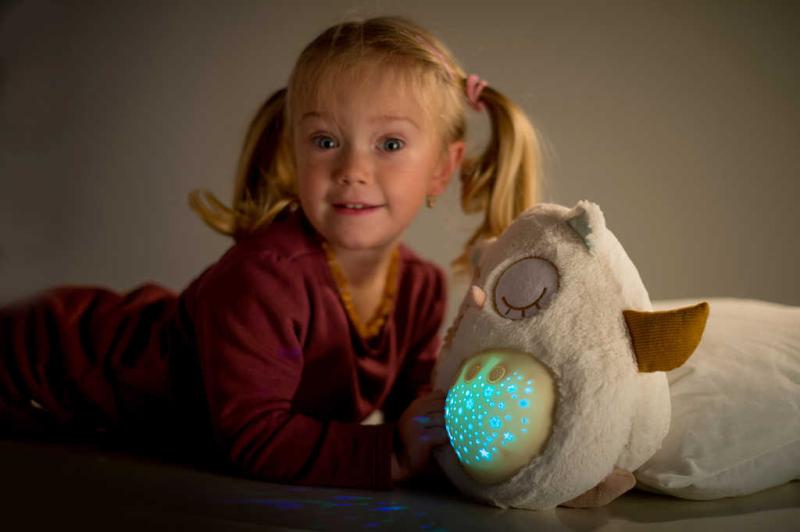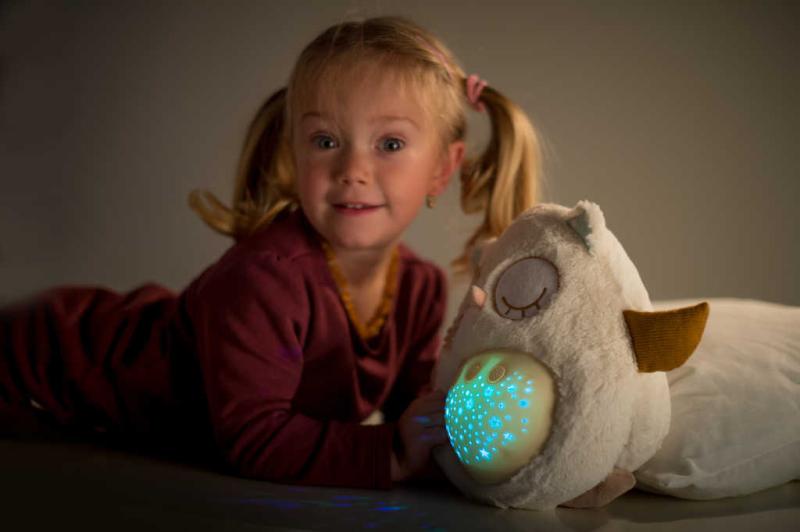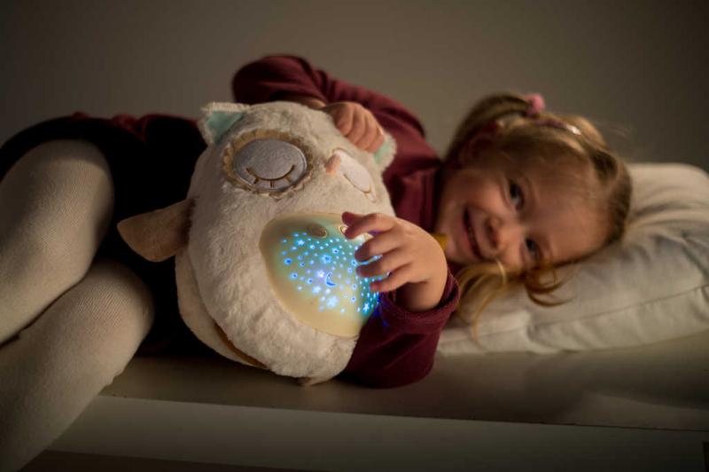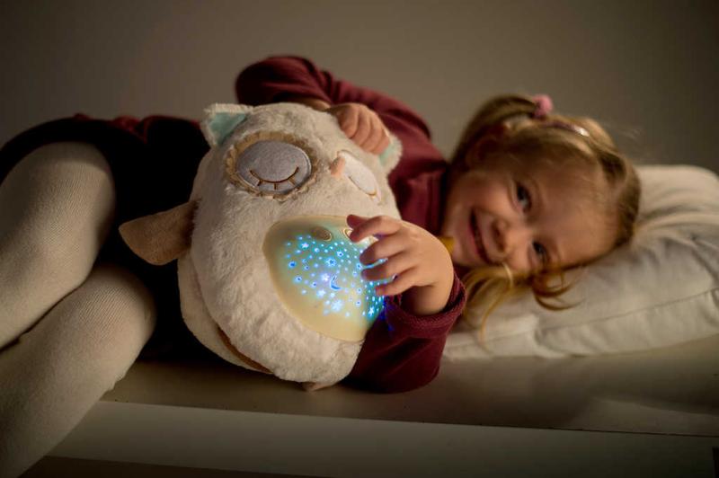 Tento plyšový usínáček v podobě sovičky pomáhá dětem snadněji usnout za pomocí příjemných melodií a tlumeného světla. Po zmáčknutí tlačítek na bříšku se z pokojíčku stane rázem říše snů. Sovička promítá noční oblohu v 8 barvách, hraje 8 ukolébavek a také zvuky, na které jsou děti zvyklé od maminky z bříška. Hračka se světlem a zvukem, na baterie.