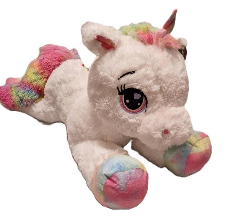 Plyšový ležící jednorožec - bílý s duhovými doplňky.