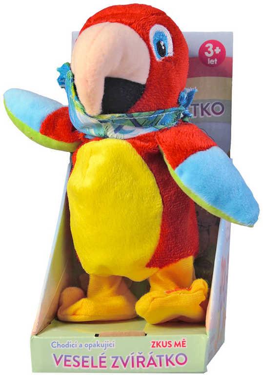 Opakující a chodící papoušek. Veselé plyšové zvířátko opakuje, co slyší a chodí. Hračka se zvukem na baterie. Zabaleno v českém otevřeném boxu.Tento barevný papoušek je určen malým dětem, které ocení milého společníka. Papoušek umí ožít dětem pod rukama.