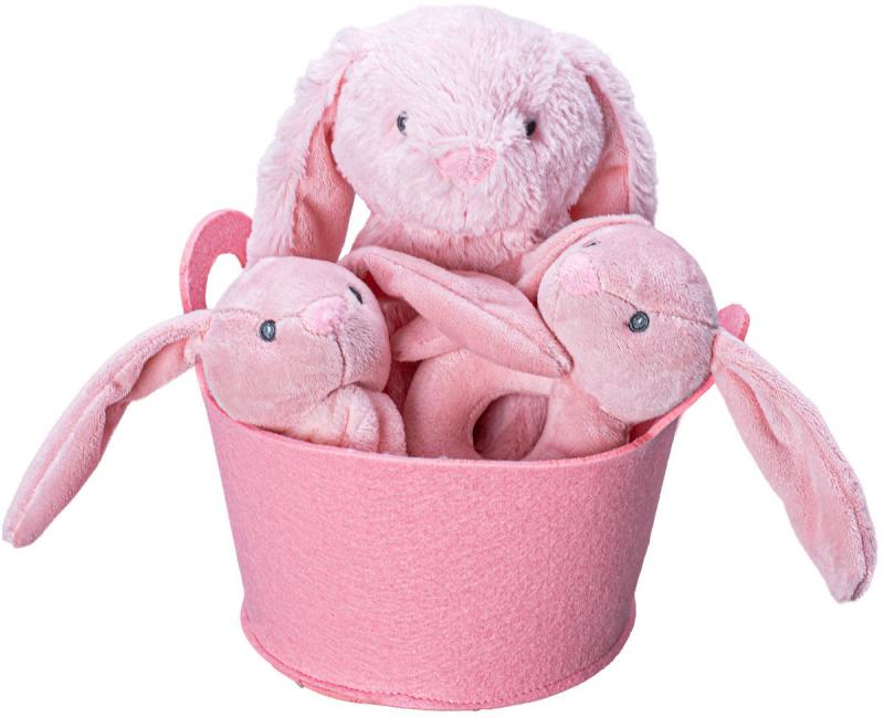 PLYŠ Zajíček růžový set s chrastítkem a usínáčkem v košíku pro miminko