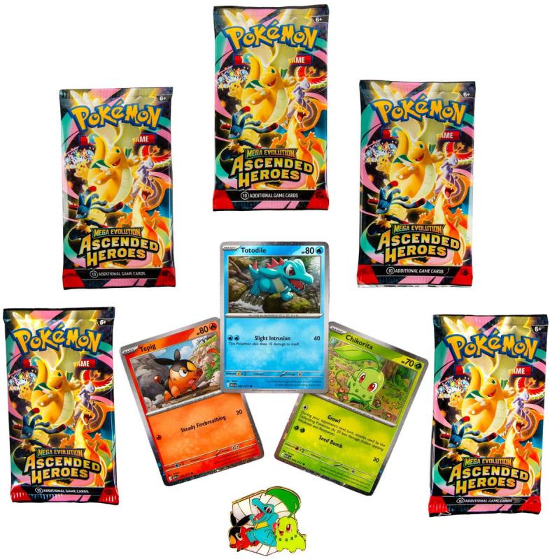 Každá nová cesta Pokémonů začíná jedním zásadním krokem: výběrem svého prvního partnera Pokémon! S touto krabičkou můžete získat travního Pokémona Chikoritu, ohnivého Pokémona Tepiga a vodního Pokémona Totodila jako lesklé promo karty s fólií, a také deluxe odznak (pin), který zobrazuje všechny tři Pokémony dohromady. Součástí jsou také pět booster balíčků z rozšíření Mega Evolution—Ascended Heroes.