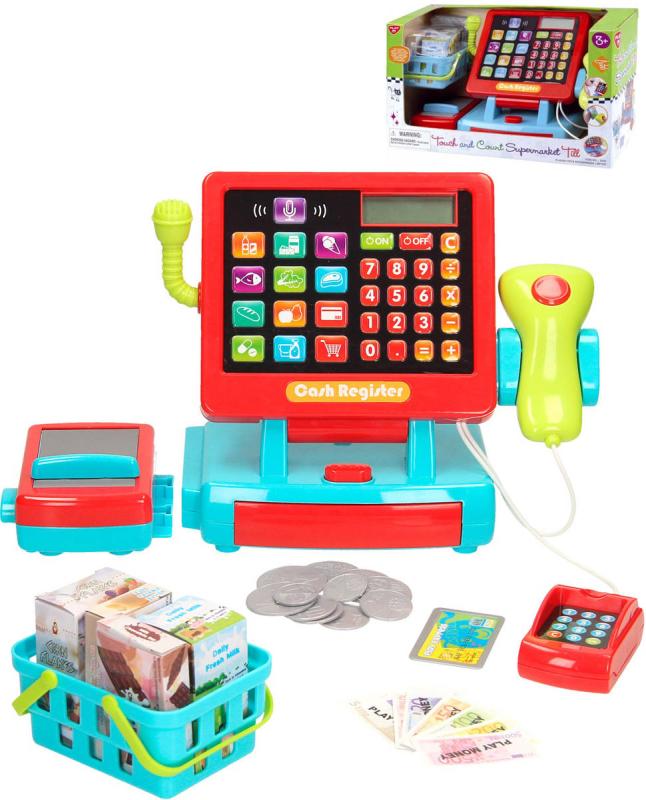 Dětská plastová dotyková pokladna, registrační kasa na baterie, se světlem a zvukem. Součástí dětské peníze, nákupní košík, skener, čtečka karet a další doplňky.Děti si mohou zahrát na obchod s pokladnou, která reaguje na dotyk. Balení obsahuje mnoho doplňků, které do obchodu patří.