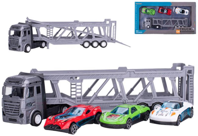 Kovový herní set přeprava aut. Součástí transportér a 3 sportovní auta s pohonem na volný chod. Velikost vozidel 22 / 7cm.Autíčka - hračka, která fascinuje děti všech věkových kategorií. Od realistických modelů sportovních vozů až po různá vozítka, auta stimulují kreativitu a umožňují dětem prožít vlastní dobrodružství. Jsou ideální nejen pro zábavné hry, ale také pro rozvoj jemné motoriky, koordinace očí a rukou a prostorového myšlení. Hledáte-li dokonalý dárek pro malé motoristické nadšence, autíčka jsou jasnou volbou.