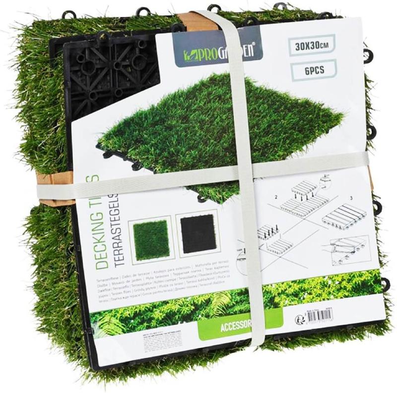 Tato 6dílná sada dlaždic z umělé trávy od ProGarden je vynikající volbou pro zdobení povrchů na vaší zahradě, na terase nebo kolem bazénu.Pěkný zelený dekor: Dlaždice z umělé trávy jsou vyrobeny z polyetylenu v pěkném vzhledu zelené trávy. Sestavte šest dlaždic z umělé trávy a vytvořte pěknou přívětivou zelenou plochu!