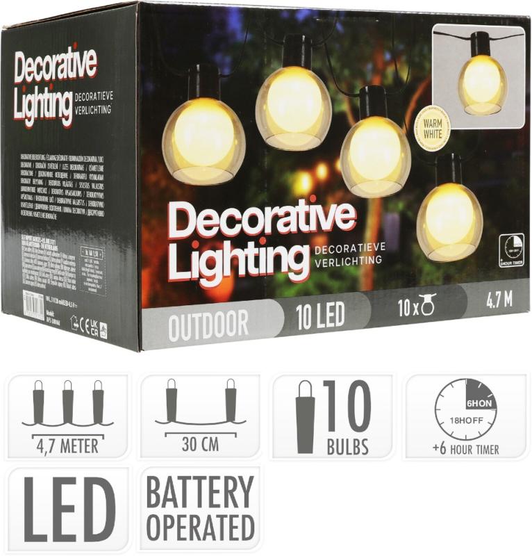 LAMPIONS 10 PIECES ON LIGHT CHAIN, PP, DIA 70XH80MM, SMOKED GLASS LAMPSHADE, EACH LAMPION WITH 1X WARM WHITE LED, B/O, 3X AA BATTERY (NOT INCLUDED), LEAD WIRE 2M, BULB DISTANCE 30CM, IP44, WITH TIMER, PACKED IN COLORBOX/ 250X180X170MM, Colour Box (CLB): WEEE / CFT 1,92,(7.200/40ft HQ)872057351772018.7