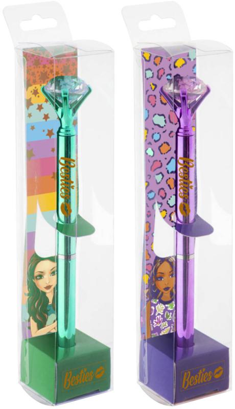 Luxusní propiska od Besties s lesklým fialovým, azurově modrým nebo růžovým vzhledem a velkým "diamantem" na jeho horní části. Pište stylově!