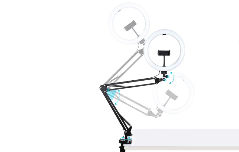 Výšku stojanu můžete nastavit, pro ještě větší pohodlí je navíc nastavitelný o 180 a 360 stupňů. Je vyroben z vysoce kvalitního materiálu, takže je odolný a má dlouhou životnost. Dvojité závěsné pružiny na každém rameni výložníku chrání lampu před náhlými pády. Kromě toho lze držák volně ohýbat, takže světlo dopadá v úhlu, který vám nejlépe vyhovuje. Svorka na základně se připevní k libovolné tloušťce pracovní desky. Máte tak volné ruce a můžete volně nahrávat videa.