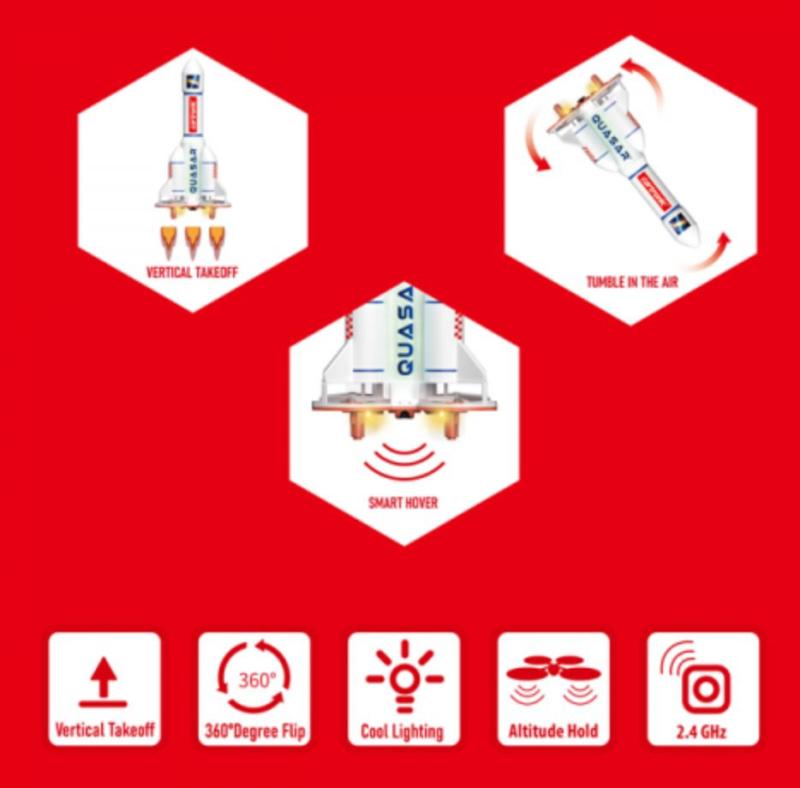QUASAR raketový dron 2.4 GHz je unikátní kvadrokoptéra s autostratem, autopřistáním, barometrem, čídly proti nárazu, LED osvětleníUNIKÁTNÍ DESIGN * NOVINKA * DETEKCE PŘEKÁŽEK * AUTOSTART * AUTOPŘISTÁNÍ * LED OSVĚTLENÍ * BAROMETR * PŘEMETY * KOMPAS * VÝŠKA 34 cm