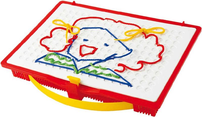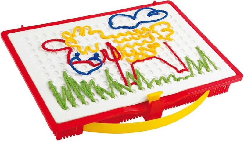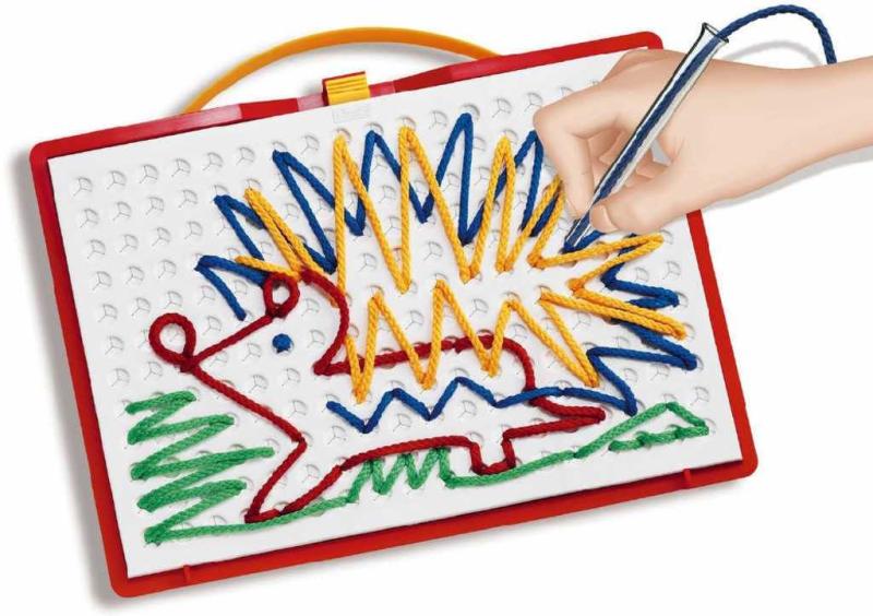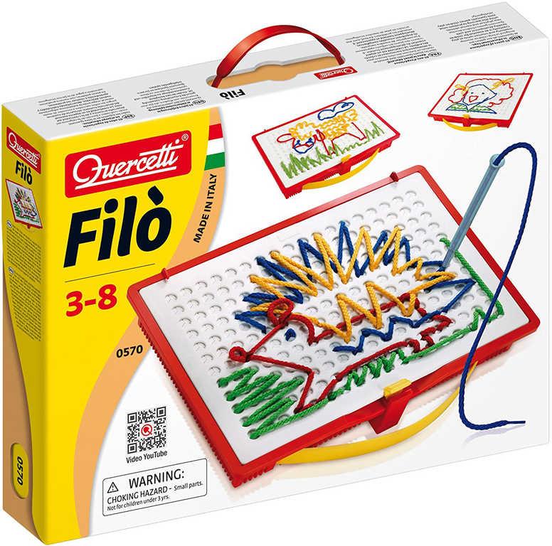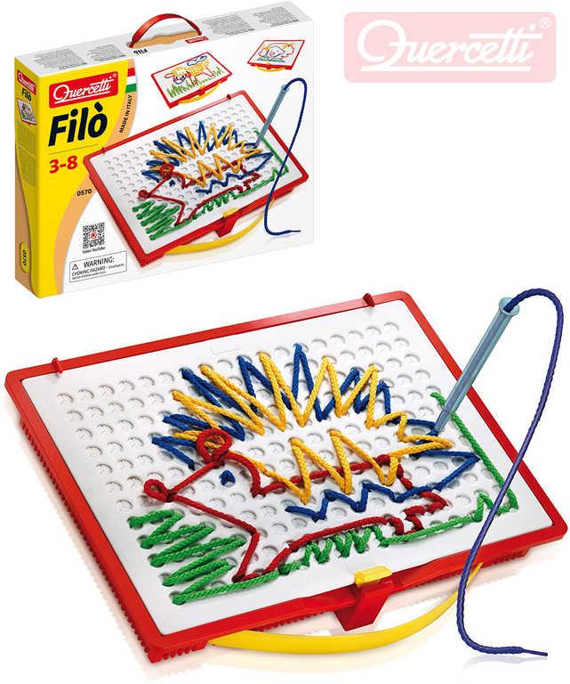 Filo Quercetti dětská výtvarná souprava. Obrázky a vzory tvořte zasouváním šňůrek pomocí speciálních per do otvorů hrací desky, která je současně víkem kufříku. Po vyjmutí pera z otvoru se otvor zatáhne a barevnou šňůrku pevně drží. Přiložená brožurka obsahuje příklady, kterými se začátečníci mohou řídit a také 8 karet s 16 vzory. Kvalitní provázková stavebnice rozvíjí jemnou motoriku, manuálně-vizuální koordinaci a tvořivost.
