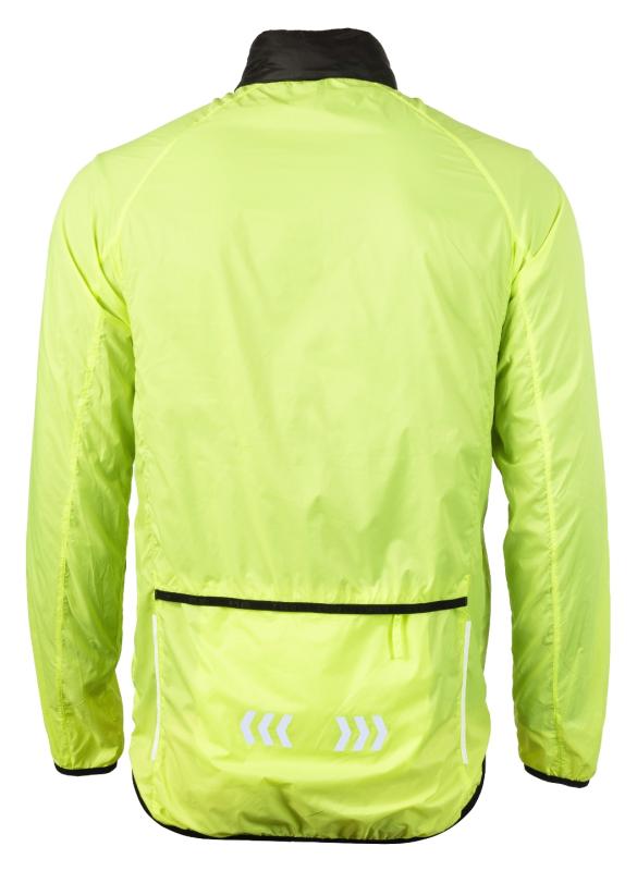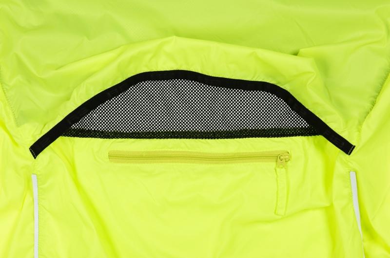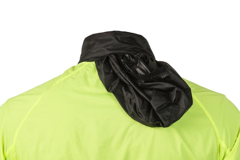 Má dlouhý hlavní zip, který je na konci pod bradou překrytý ochrannou légou. Nastavitelné odvětrání na předním i zadním díle poskytuje pocit komfortu a lze korigovat pomocí zipů. Bundu můžete velmi snadno během několika vteřin sbalit do zadní kapsy. Sbalená bunda se vejde i do zadní kapsy na dresu a můžete ji tak mít u sebe při každé vyjížďce. Když je počasí opravdu nepříjemné, může vám posloužit kapuce, která je schovaná v límci. Díky gumě v lemu kapuce vám perfektně přilne k hlavě. Límec je z vnitřní strany z počesaného materiálu. 100% polyester