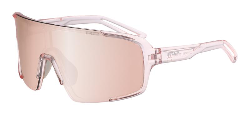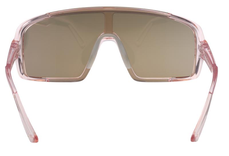 Šošovky z nárazuvzdorného polykarbonátu poskytujú zvýšenú bezpečnosť očí a sú opatrené špeciálnou zrkadlovou vrstvou v ružovo-zlatom chróme. Táto vrstva výrazne obmedzuje množstvo prenikajúceho svetla tým, že ho odráža, čo oceníte pri jasnom slnečnom svite. Povrchová úprava je lesklá s kryštalickým efektom, ktorý dodáva okuliarom elegantný a hravý vzhľad.