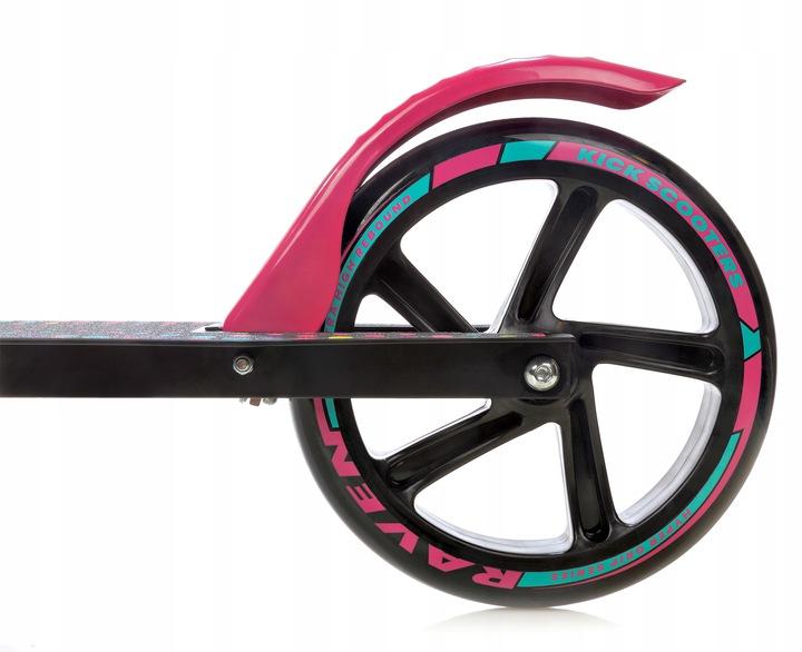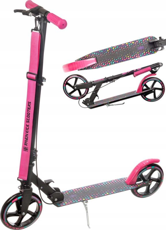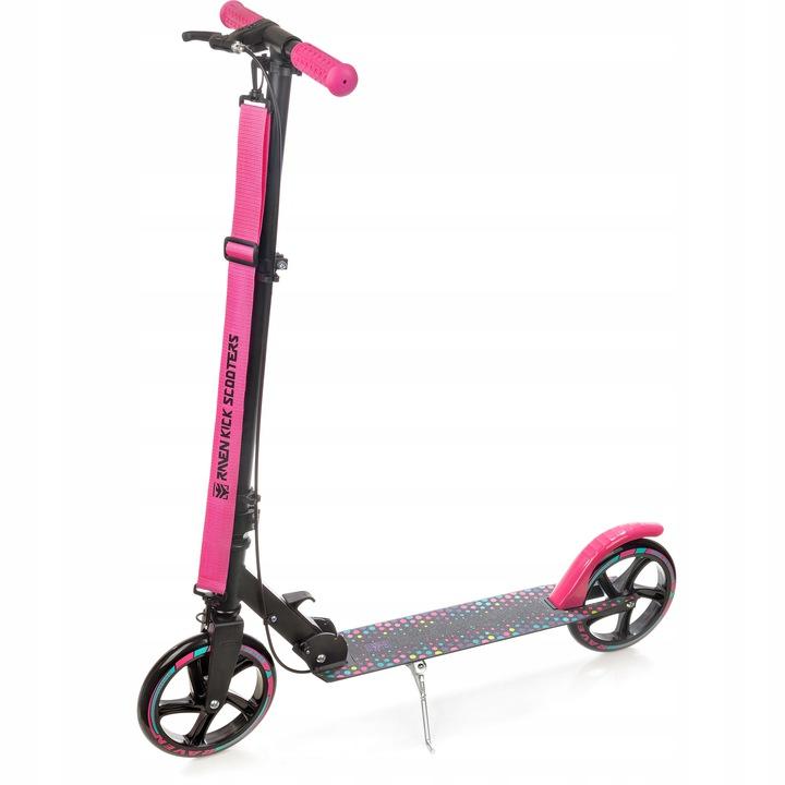 Skládací koloběžka Raven se 200 mm kolečky. Nosnost 100 kg. Popruh, který vám umožní zavěsit koloběžku.Skládací koloběžky RAVEN s kolečky o průměru 200 mm se doporučují dospělým i dětem od výšky přibližně 115 cm (děti od 5 let) do výšky 180 cm.• Ložiska: Abec-9