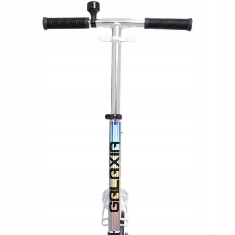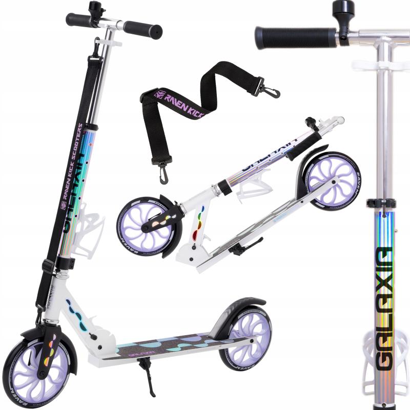 Skladacia kolobežka RAVEN Galaxia Blue/Pink so zvončekom, držiakom na fľašu s vodou, LED kolieskami. 3-stupňové nastavenie výšky riadidiel. Skladacie kolobežky RAVEN s kolesami o priemere 200 mm sa odporúčajú dospelým aj deťom od výšky približne 115 cm (deti od 5 rokov) do výšky 180 cm.• Značka: RAVEN