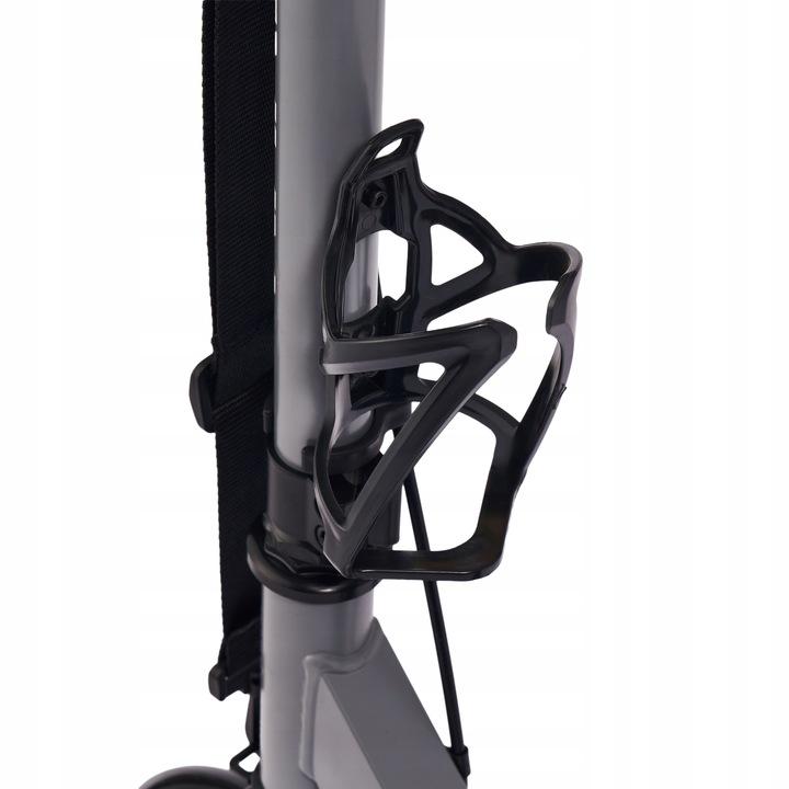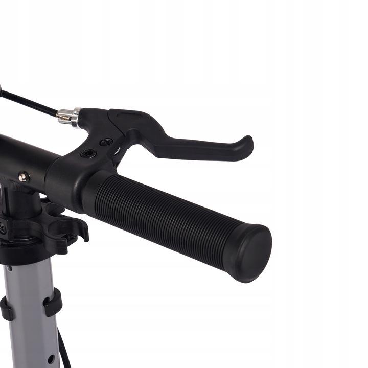 Koloběžka se snadno skládá včetně řidítek, což usnadňuje její přepravu a skladování. Zadní kolo je vybaveno dvěma typy brzd - nášlapnou brzdou pro rychlé zastavení a ruční třecí brzdou, která slouží k plynulému dobržďování. Součástí výbavy je také stojan, zvonek a praktický držák na lahev, což oceníte při delších vyjížďkách.