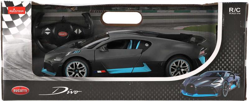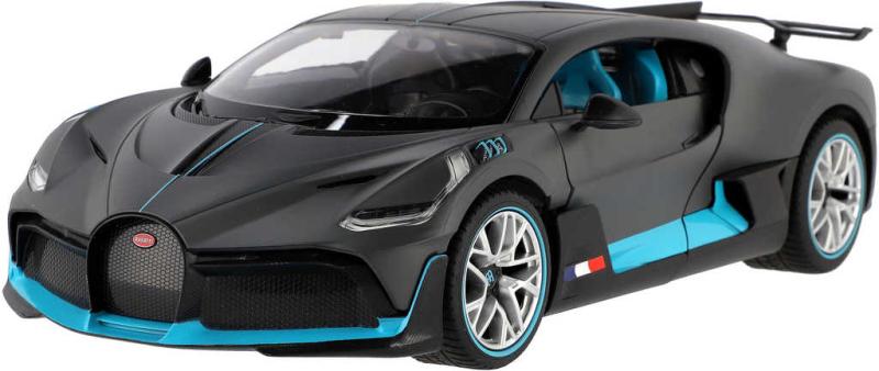 Krásný RC model auta Buggatti Divo v šedé barvě s modrými prvky. Jedná se o propracovaný model s plastovými doplňky, auto má otevírací dveře. Auto je na dálkové ovládání ve tvaru sportovního volantu a dokáže se pohybovat do čtyř směrů - dopředu, dozadu, doprava a doleva.