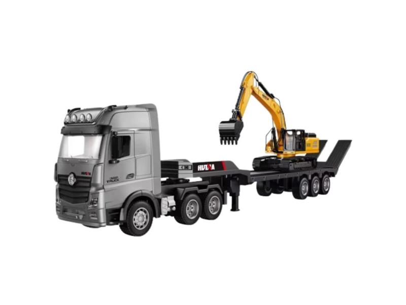 Dálkově ovládaný nákladní vůz s přívěsem a bagrem v měřítku 1:18 nabízí realistické ovládání, světelné a zvukové efekty a pevnou konstrukci pro zábavu doma i venku. zobrazit celý popis