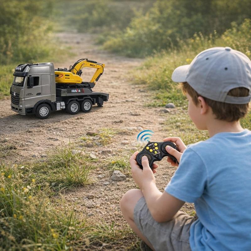 Dálkově ovládaný nákladní vůz s přívěsem a bagrem v měřítku 1:18 nabízí realistické ovládání, světelné a zvukové efekty a pevnou konstrukci pro zábavu doma i venku.