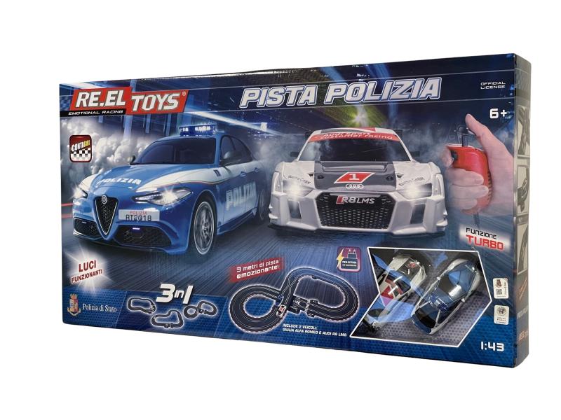 Autodráha RE.EL Toys POLIZIA 1:43,délka 3 metry, 3 varianty okruhu, LED světla, počítadlo kol.AUTODRÁHA AUDI R8 LMS GT3 A ALFA ROMEO POLIZIA * DÉLKA 3 METRY * 3 VARIANTY SESTAVENÍ * LED SVĚTLA * TURBO TLAČÍTKO * POČÍTADLO KOL