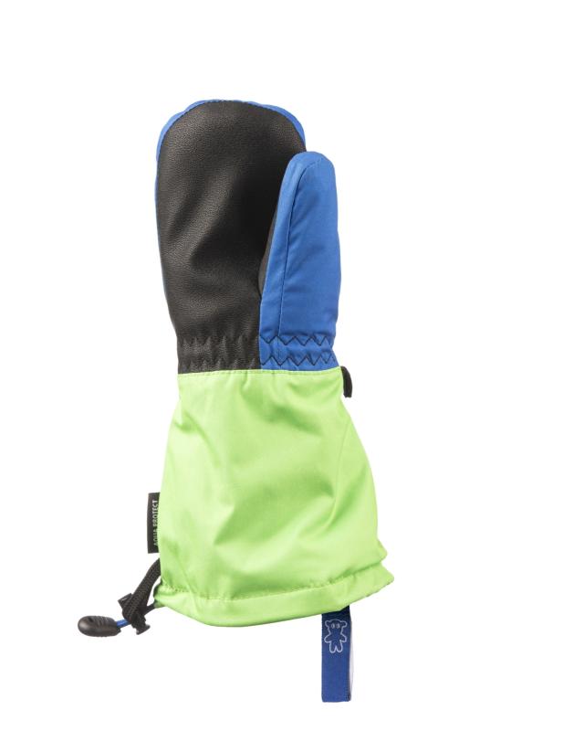 Praktické poutko z pružného materiálu se nasazuje na zápěstí, což zabraňuje ztrátě rukavic a usnadňuje jejich svlékání. Tento detail ocení především rodiče i děti při aktivním pohybu.