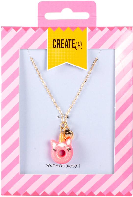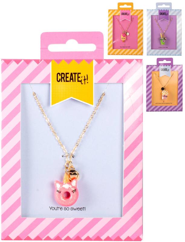 Holčičí řetizek na krk, s plastovým přívěskem Candy - čtyři různé druhy přívěsků s motivem sladkostí.Představujeme náhrdelník Create it! - dokonalý doplněk pro vaši malou módní nadšenkyni! Připravte se na rozkošnou "hostinu", která spojuje módu a zábavu tím nejchutnějším způsobem. Tento originální náhrdelník dodá šatníku vašeho dítěte ten správný náboj. Každý náhrdelník z této řady je pečlivě vyroben s důrazem na detail. Tyto náhrdelníky jsou vyrobeny z nejkvalitnějších materiálů inspirovaných oblíbenými pochutinami a jsou prostě neodolatelné.