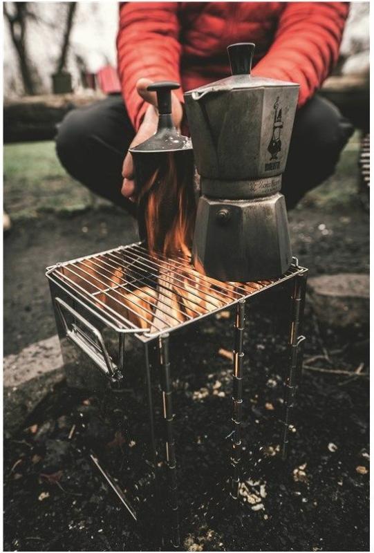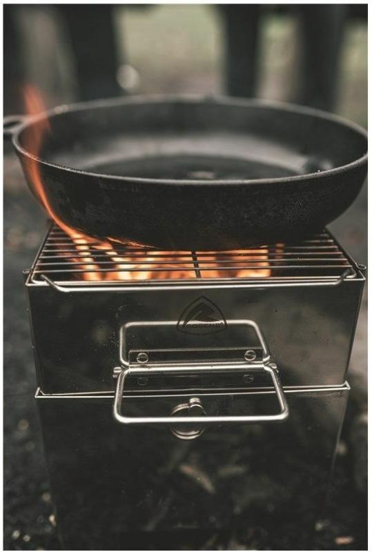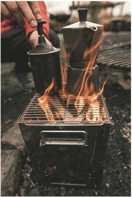 -robustní vařič na dřevo se širokou horní částí pro použití s většími hrnci nebo jako gril-bez problémů spálí větve a větší kousky dřeva - není potřeba vozit s sebou palivo