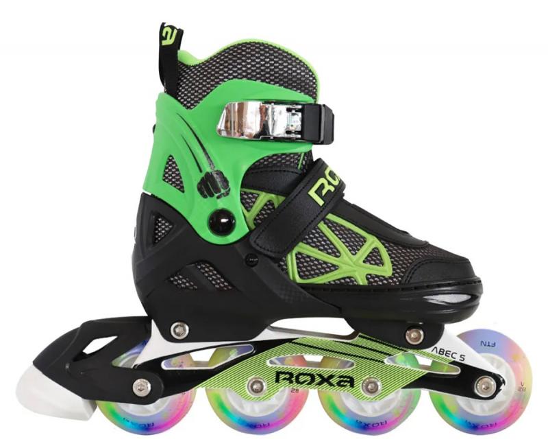 Detské kolieskové korčule s nastaviteľnou veľkosťou a svietiacimi kolieskami.Pevný skelet s mäkkou šnurovacou vnútornou topánkou. Velcro pásik a členková pracka.